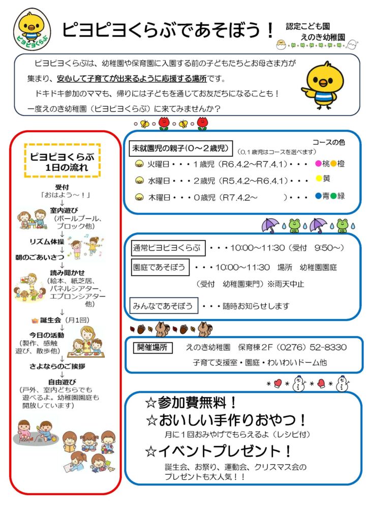 お知らせ 令和8年度 ピヨピヨくらぶのご案内【未就園児教室】 2026.03.01 子育て支援のページにもありますが、当園では未就園児教室のピヨピヨくらぶを開催しています。 年齢別に曜日を設定していますので、お子様同士の交流や、同じ年の子を持つお母さま同士のリフレッシュの場として利用していただければと思います。 ※令和8年度の受付を開始しています。 ☆★☆参加申込はこちらから、または電話、直接来園にて随時承っております。(0276-52-8330)☆★☆ 令和8年度ピヨピヨくらぶの詳細スケジュールです。 古い記事へ